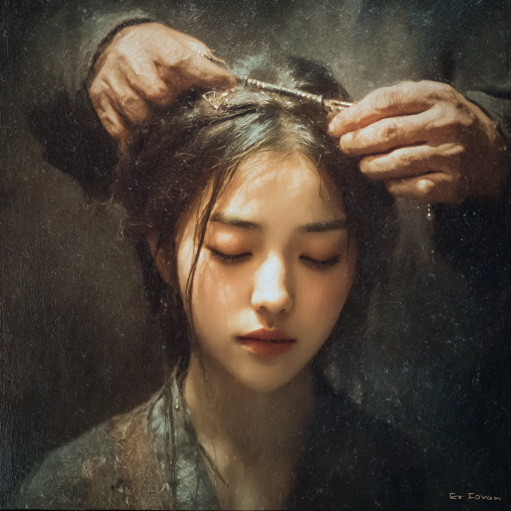 This Vessel, is a "Scepter Form Hairpin"; its "Form" (Xing-Zhi) is slender and "Stately". The main body, is a, "Flower of Grace" intricately carved from "Natural MOP". Its "Petals" are pearlescent-white, and, gentle, the center, formed jointly by, "Large MOP" and "Freshwater Pearls", creates the "Sacred Flower Heart". Several "Sky-Blue" "Enamel Ribbons", like "Rivers of Compassion", "Spiral" beneath the "Flower", adorned upon which, are "Blue" and "White" "Liuli Crystals". The hairpin body, is slender, and, upright, wrapped with "Pink Silk Thread", symbolizing, that "Blessing's" "Gentle Foundation".