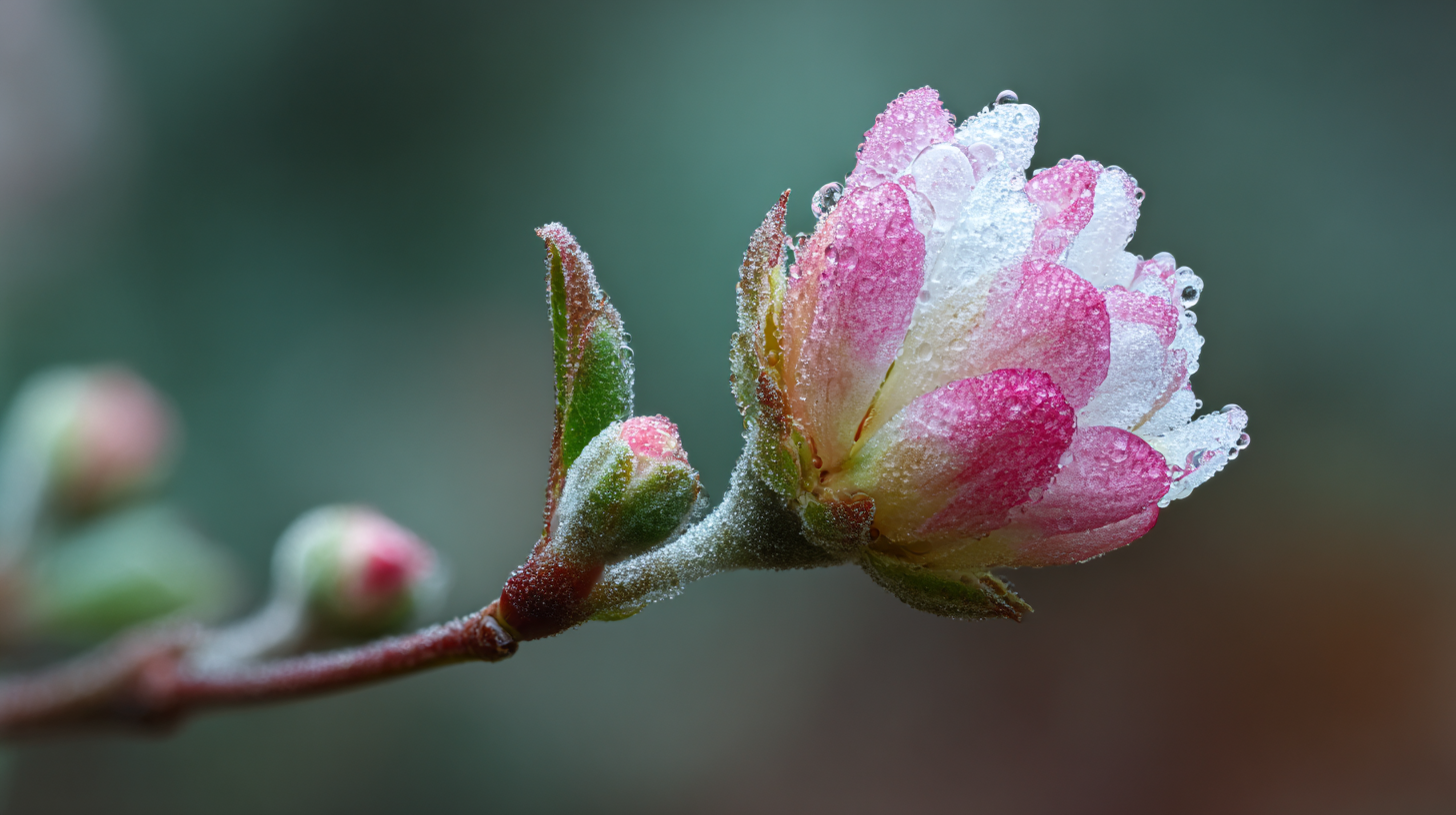 This Vessel, is a "Flower Cluster Form". The main body, is "Three" to "Five" "Flower Buds", like "Pink Mist" (Fei-Yan) in the "Dawn" (Chen-Xi). The petals, are formed from "Utmost Soft" "Mulberry Silk", presenting, a "Sacred" gradient from "Moonlight White" to "First-Born Pink". The petals, thin as "Cicada Wings", their edges un-quenched by【Fire】, are "Fully" unfurled. The flower hearts, are adorned with "Several" "Freshwater Pearls", like "Morning Dew". The hairpin body, is "Gently" wound with "Gold Thread", like a "Vine" of "Light", retaining a sense of "Sacred" "Breathing".